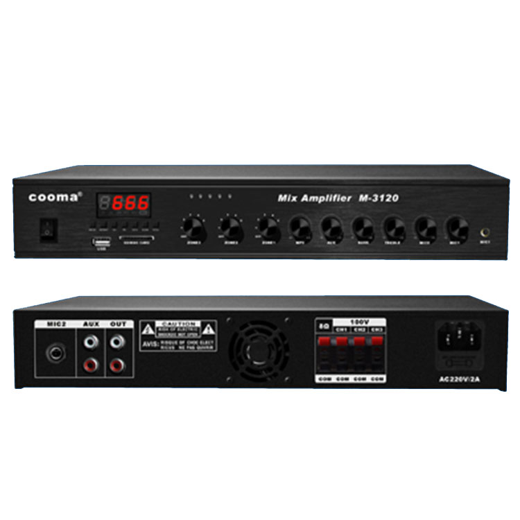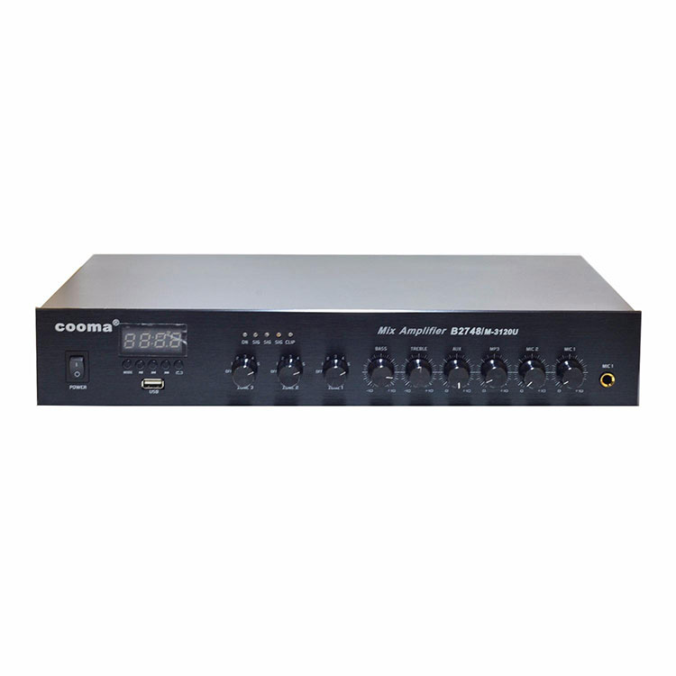 COOMA B 2748 M-3120U modelli anfiyi mağaza, işyeri ve okullarda kullanabileceğiniz 3 ayrı çıkış sayesinde ayrı bölge olarak ses ayarı yapabileceğiniz aux ve iki mikrofon girişine sahip olan 100V/120W kapasiteye sahip olan USB amfi modelidir.