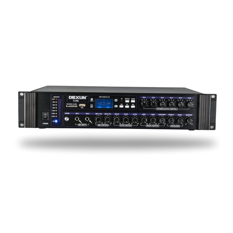 Dexun D-300, anfi alanında değerlendirilen,iki mikrofon girişine sahip olan 100V/120-250W kapasiteye sahip olan hat trafolu 6 bölgeli USB amfi modelidir. İş yerinizde ve evinizde rahatlıkla kullanabilirsiniz.