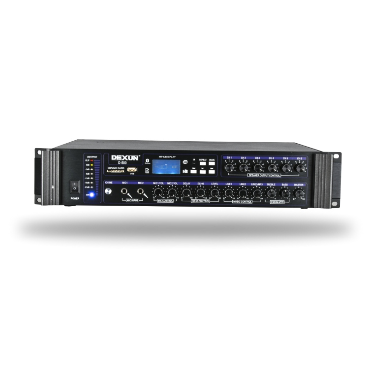 Dexun D-500, anfi alanında değerlendirilen,iki mikrofon girişine sahip olan 100V/350-700W kapasiteye sahip olan hat trafolu 6 bölgeli USB amfi modelidir. İş yerinizde ve evinizde rahatlıkla kullanabilirsiniz.