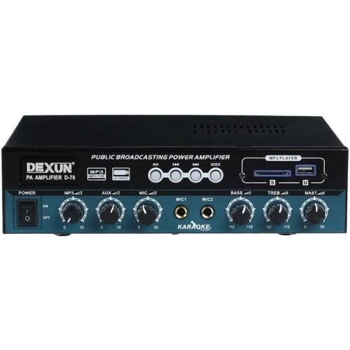 Dexun D-70, anfi alanında değerlendirilen, aux ve iki mikrofon girişine sahip olan 100v/60w kapasiteye sahip olan USB amfi modelidir.