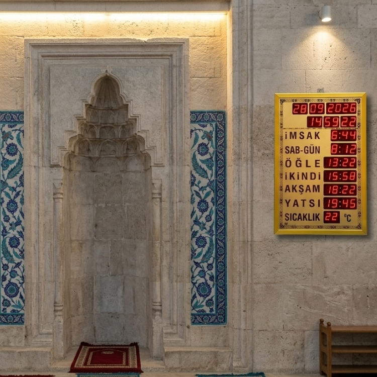 Boyut ve Tasarım: 40×60 cm ebatında büyük boyutlu bir saattir. Estetik bir görünüme sahip olup camiler için özel olarak tasarlanmıştır.
