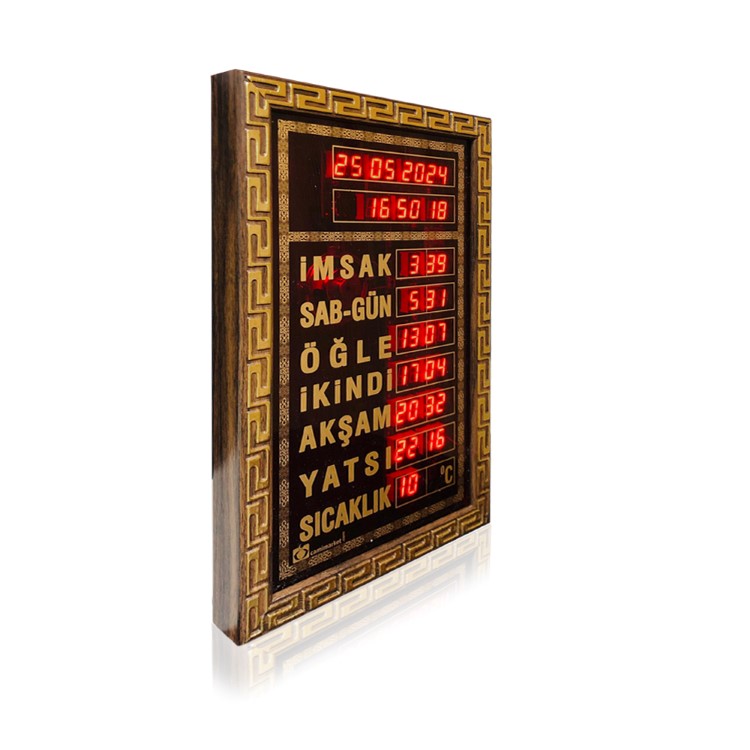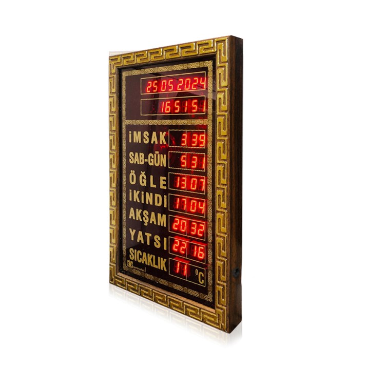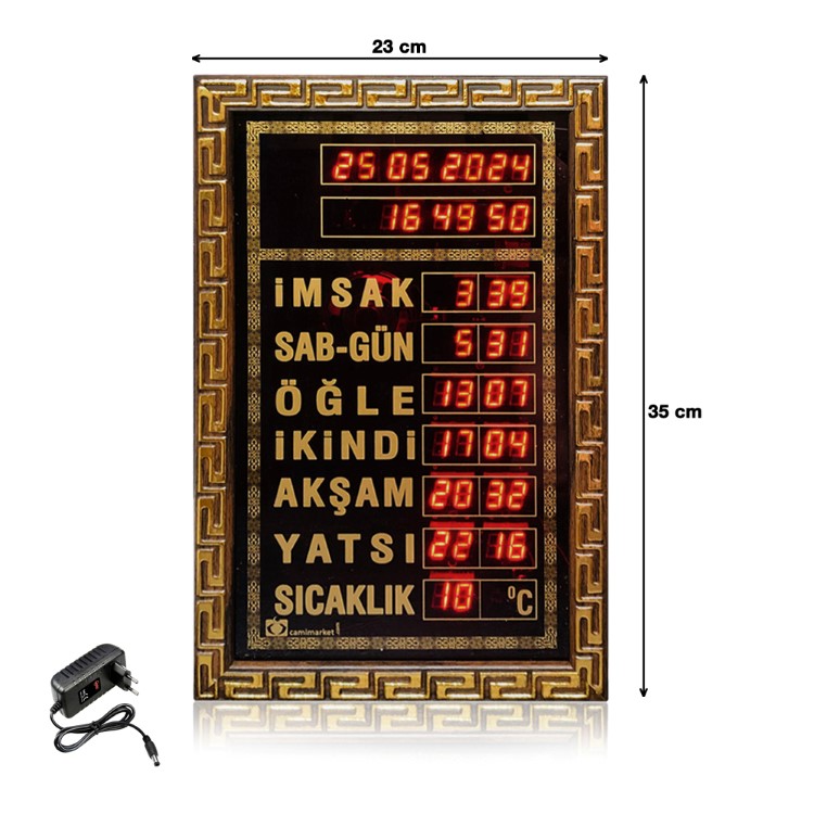 Boyut ve Tasarım: 23×35 cm ebatında bir saattir. Estetik bir görünüme sahip olup mescit,ev ve işyerleri için özel olarak tasarlanmıştır.