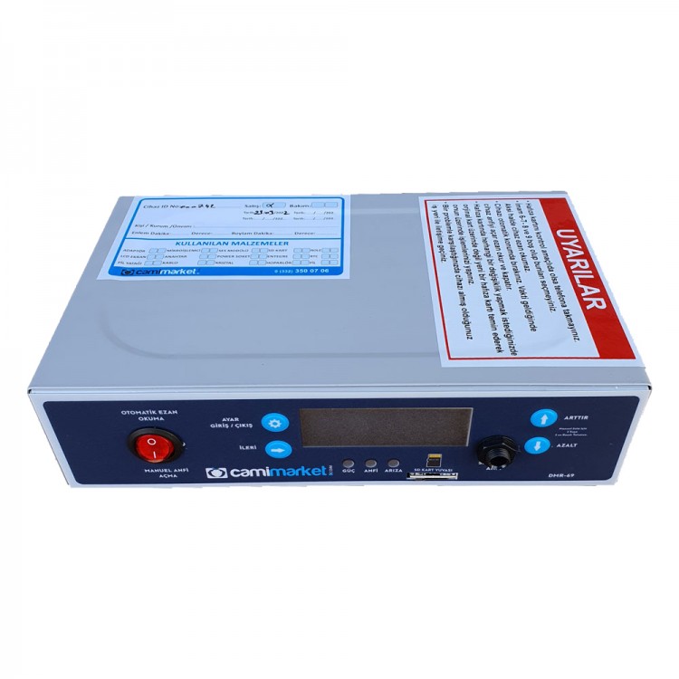 Cami Market Ezanmatik cihazı, harici hafıza kartın içerisine yüklenmiş 4 farklı imam sesi ve her vaktine uygun makamıyla okuyan cihaz modelidir. İsterseniz kendi sesinizi mp3 formatıyla yükleyip okutturabilirsiniz. Ezan vakti gelince anfiyi otomatik açıp ezan bitince anfiyi otomatik kapatabilen, namaz vakitlerini büyük lcd ekranında gösterebilen eşi benzeri olmayan mükemmel bir cihazdır.