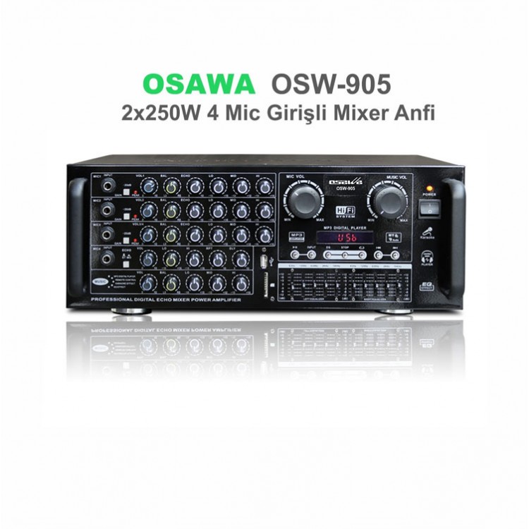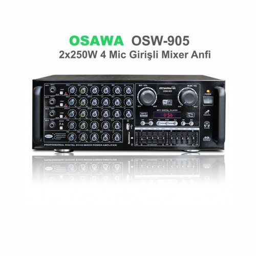 Osawa OSW-905, power anfi alanında, aux ve 4 mikrofon girişine sahip olan 2x250W çıkış gücü kapasitesine sahip USB/Bluetoothlu amfi modelidir.
