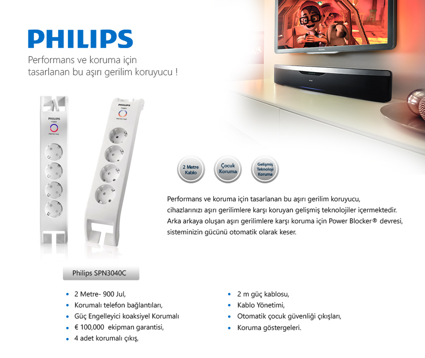 Philips SPN3040C 4'lü 900Jules Akım Korumalı Priz