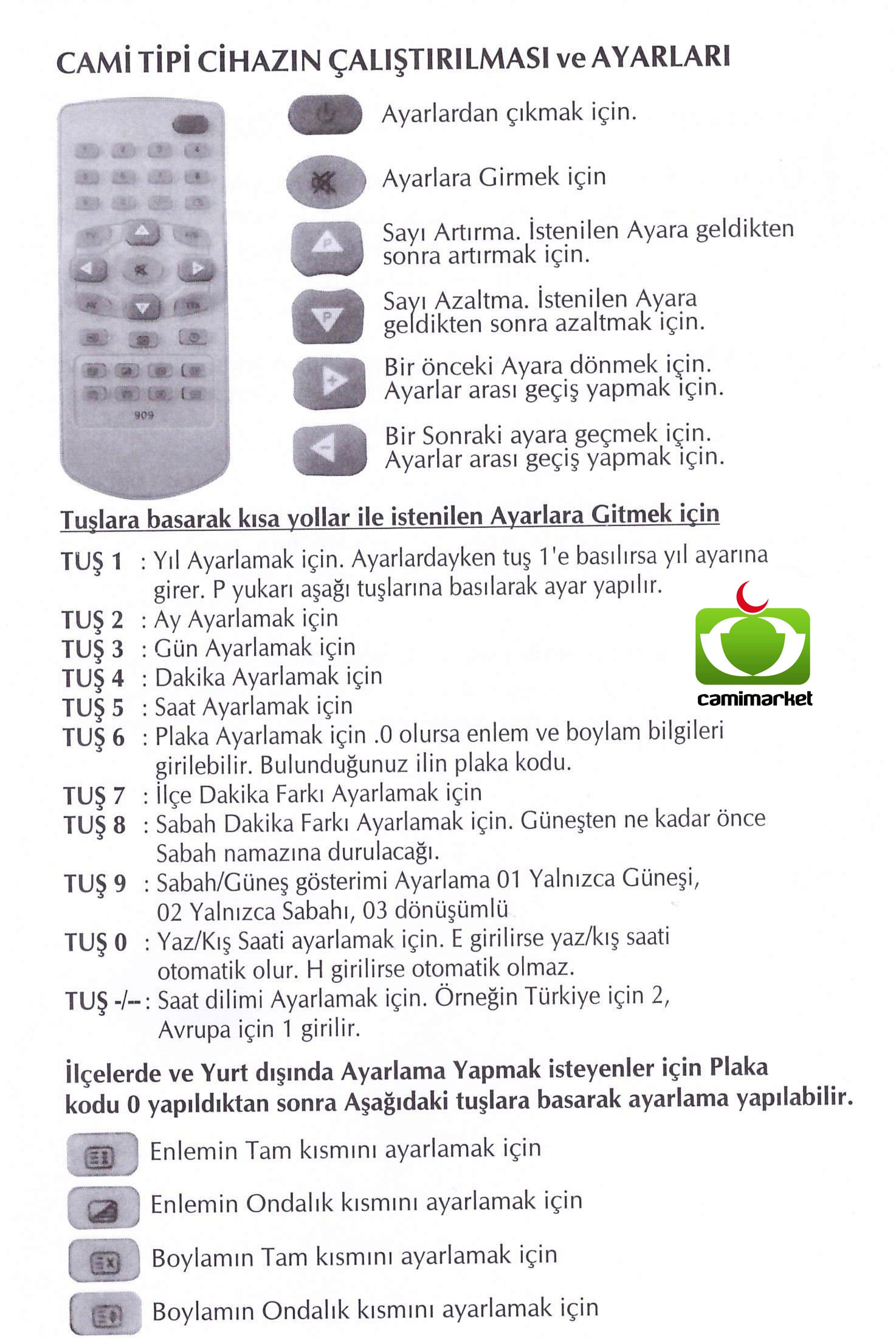 olarak ayarlayınız.P 00 yapmazsanız; cihaz Sizin enlem ve boylam girmenize yetki vermez Plaka kodunu 00 olarak ayarladıktan sonra İleri tuşuna basınız .Yukarıdaki cihazın çalıştırılması ve Ayarları bölümünde belirtilen menüler sırasıyla gelecektir.. Yukarıda belirtildiği gibi o bölümleri ayarlayarak geçiniz. YU= H menüsüen geldiğinizde bulunduğunuz ülkede İLERİ / GERİ saat uygulaması var ise Aşağı veya yukarı butonlarından herhangi birine basarak yu = E yapınız cihaz ekimin son Pazar günü saatleri 1 saat geri alır martın son Pazar günü 1 saat ileri alır. İleri tuşuna tekrar basınız burada ise genelde 2 rakamı gelecektir. 2 ise Türkiye ile İngiltere arasındaki( 0 boylamı İngiltere den geçtiği öngörülmektedir.) saat farkıdır siz bulunduğunuz ülke ile İngiltere arasındaki saat farkını giriniz.