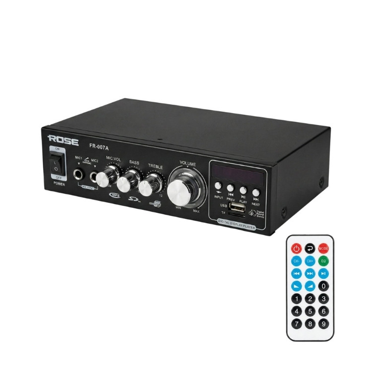 Rose FR-007A, kompakt tasarımıyla güçlü performansı bir arada sunan stereo mikser amplifikatördür. Toplam 100 Watt çıkış gücüne sahip olan cihaz; USB/MP3/Micro SD kart oynatma, Bluetooth bağlantısı ve 2 adet mikrofon girişi ile hem ev hem de iş yerleri başta olmak üzere kurumsal alanlarda ideal bir kullanım sağlar.