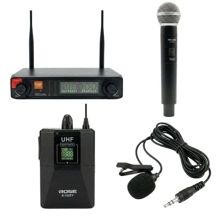 Rose R-702-EY kablosuz mikrofonlar kategorisinde yer alan UHF kablosuz el yaka mikrofonudur. UHF kablosuz sistem, düşük gecikme, parazite karşı güvenlik gibi özellikleriyle ön plana çıkmaktadır.