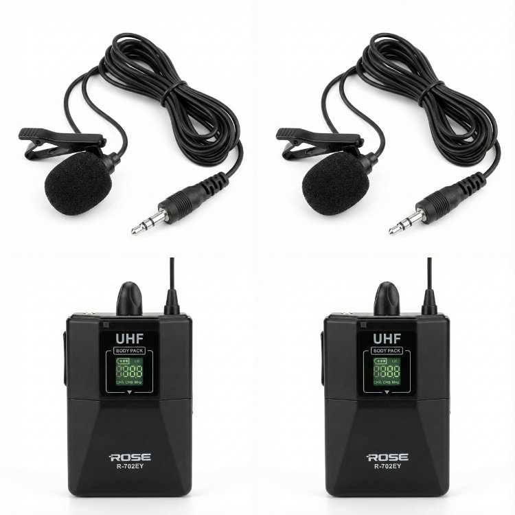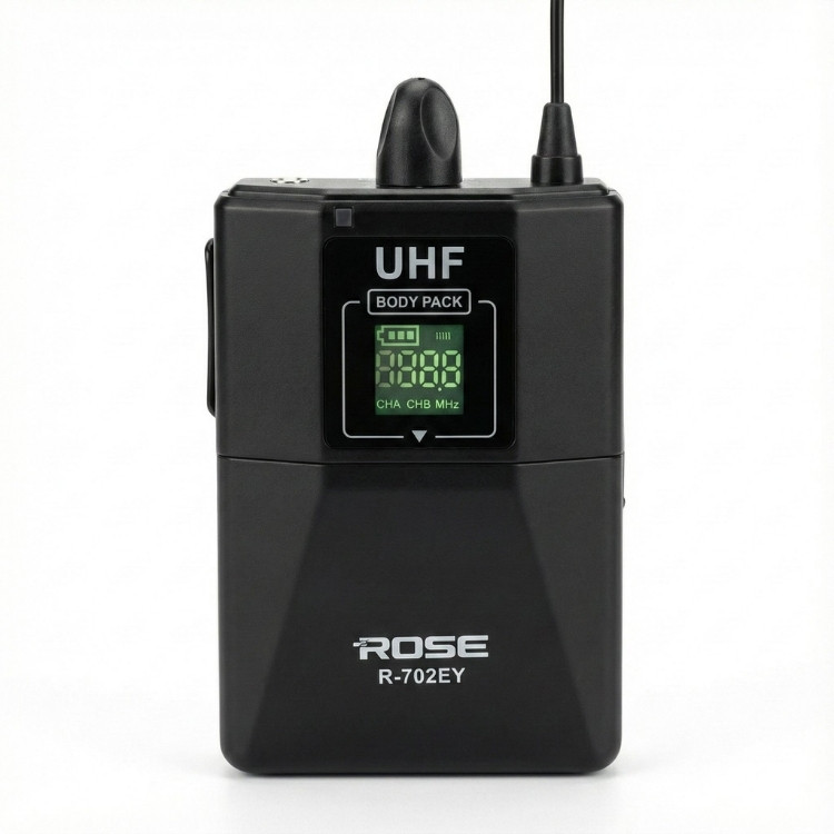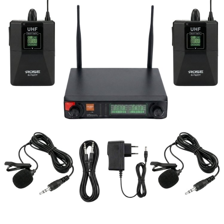 Rose R-702-YY kablosuz mikrofonlar kategorisinde yer alan UHF kablosuz çift yaka mikrofonudur. UHF kablosuz sistem, düşük gecikme, parazite karşı güvenlik gibi özellikleriyle ön plana çıkmaktadır.