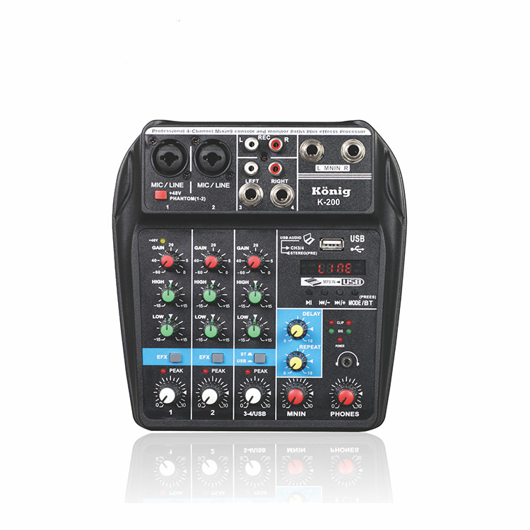 König K-200, deck mikser ana kategorisinde bulunan 4 kanallı usb, bluetooth ve echo özellikli +48 phantom güç sağlayabilen deck mikser modelidir.