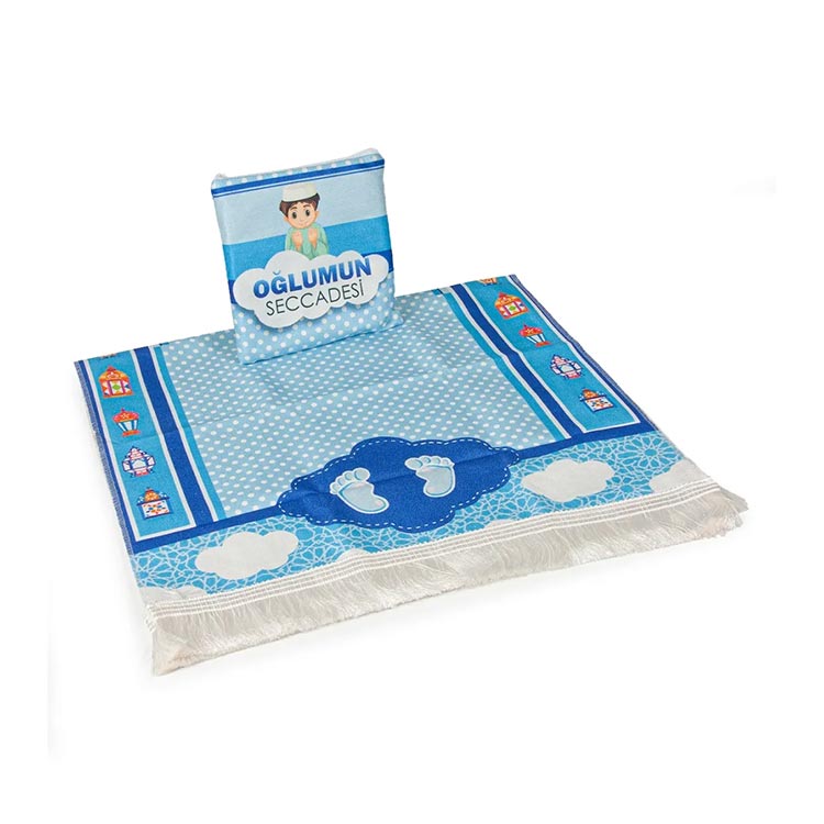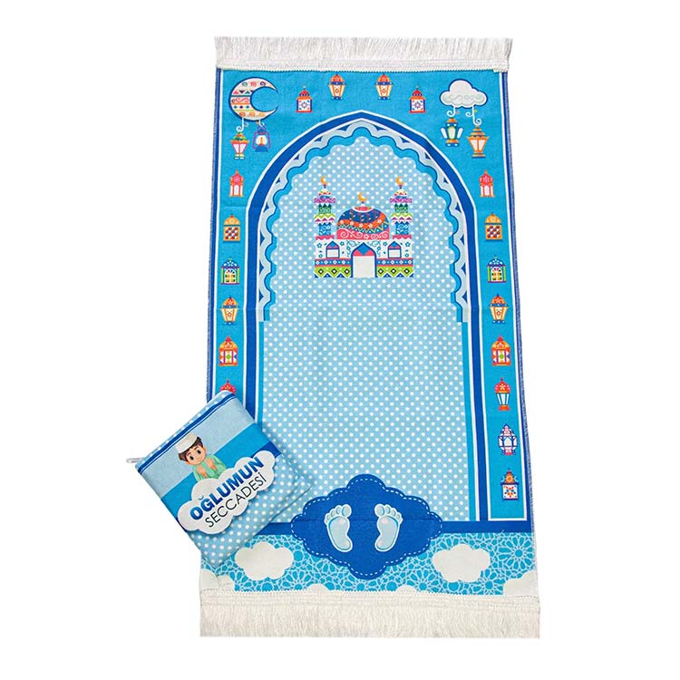 Çantalı çocuk seccadesi, miniklerin namaza alışmasını kolaylaştırmak için özel olarak tasarlanmıştır. 42×90 cm boyutundaki seccade, kullanılmadığında 18×19 cm ölçülerindeki fermuarlı kılıfına katlanarak yerleştirilir. Hafif ve taşınabilir yapısıyla çocuklar için evde, kursta veya yolculukta rahat bir kullanım sunar. Mavi renkli “Oğlumun Seccadesi” modeli, şık tasarımı ve pratikliğiyle çocuklara namazı sevdirmeyi hedefler.
