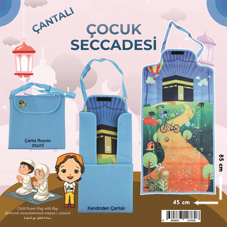 Bu özel tasarımlı çocuk seccadesi, katlandığında pratik bir çantaya dönüşerek kolayca taşınabilir. Mavi renkli ve şirin desenleriyle erkek çocuklarının ilgisini çeker, ibadete karşı sevgi ve merak uyandırır. Hem seccade hem de taşıma çantası işlevi gören bu ürün, evde, kursta veya yolculukta kullanıma uygundur. Hafif ve pratik yapısıyla çocukların kendi seccadelerini taşımalarına imkan sağlar.