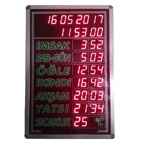 Büyük Boy Cami Saati, 40x60 cm boyutunda arkasındaki tuşlar sayesinde kolay ayarlanabilir olması ve her vakite dakika farkı girebileceğiniz, namaz vakitlerini gösteren bir dijital saat olarak tasarlanmıştır.