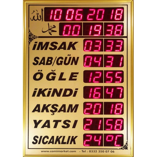 Dijital namaz saati, Saat ve tarihi gösterir.