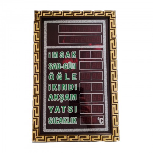 Boyut ve Tasarım: 23×35 cm ebatında bir saattir. Estetik bir görünüme sahip olup mescit,ev ve işyerleri için özel olarak tasarlanmıştır.