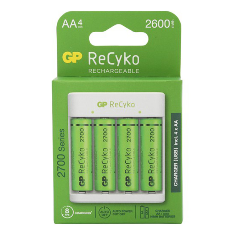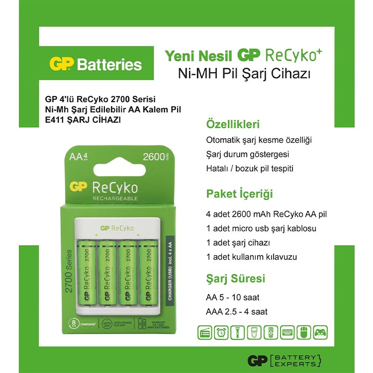 4 Adet şarj edilebilir GP Recyko AA 2700 mAh pil ile donatılmıştır.
