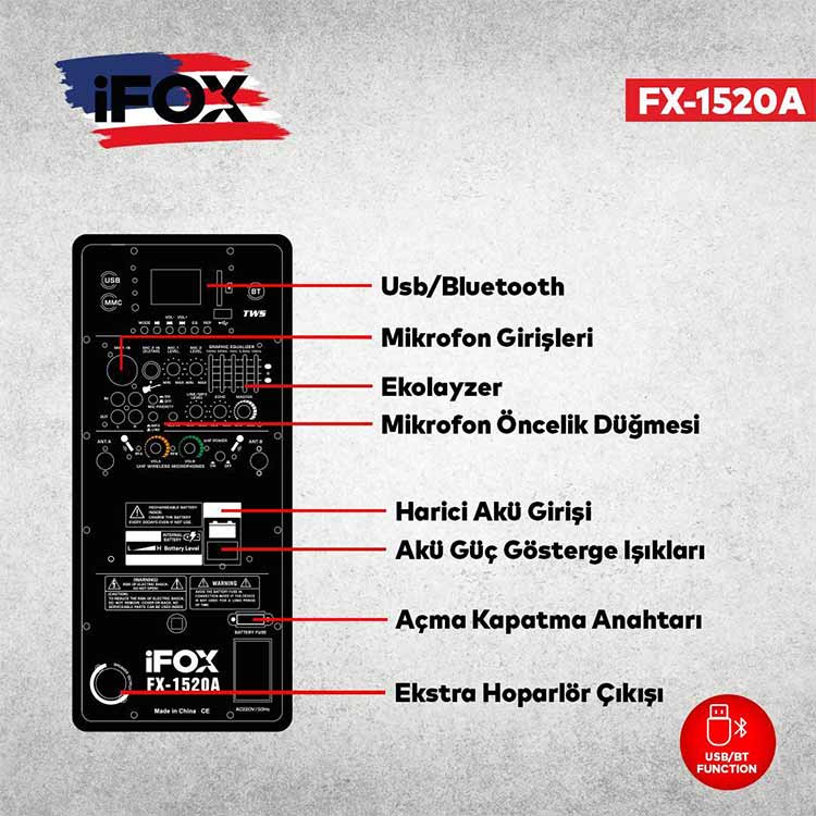 Çeşitli fonksiyonları içinde barındıran iFOX FX-1520A, USB, MMC, Bluetooth ve Micro Priority özellikleriyle kullanıcıya geniş bir bağlantı seçeneği sunar. Frekans tepkisi 50Hz ile 20KHz arasında olduğundan geniş bir ses yelpazesini kapsar. 220V / 50Hz gerilim ile çalışır ve yüksek hassasiyeti olan 96 dB ile detaylı ses deneyimi sağlar.