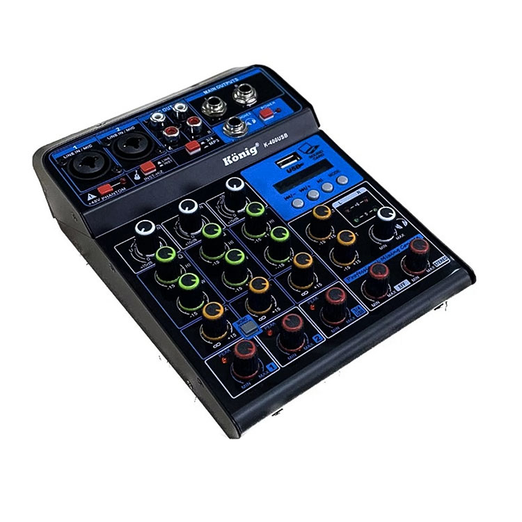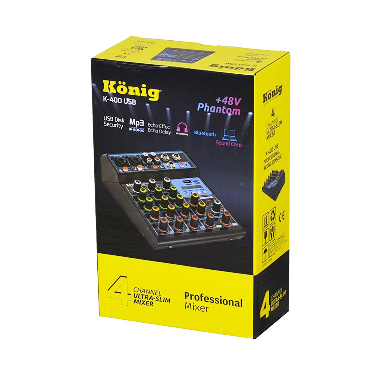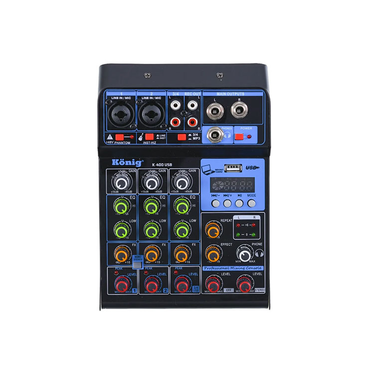 König K-400, deck mikser ana kategorisinde bulunan 4 kanallı usb, bluetooth, echo, ses kart özellikli +48 phantom güç sağlayabilen deck mikser modelidir.