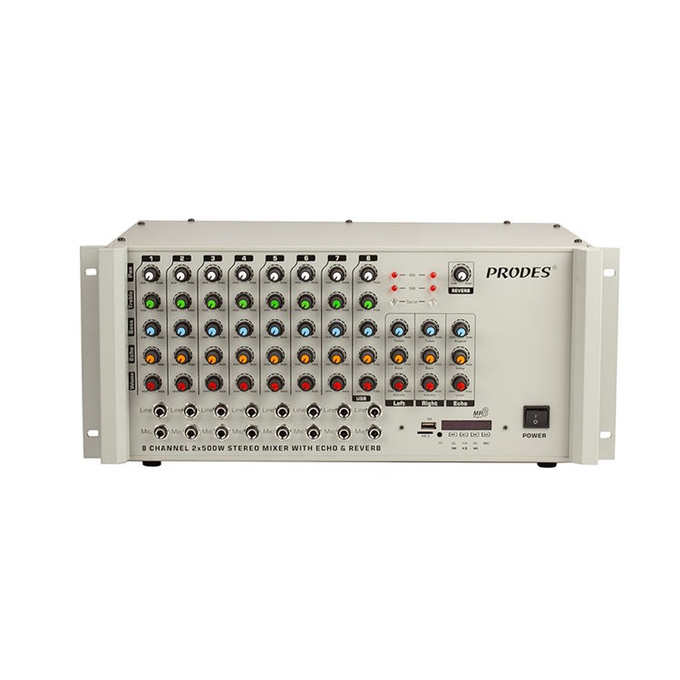 PRODES 8C2400EU ses mikseri modelidir. 8 kanallıdır ve 2x500 Watt' a  ulaşan gücüyle profesyonel bir kullanım sağlar. Ürünümüzde 8 mikrofon girişi ve 8 line girişi bulunur. Ayrıca ekolu ve reverblidir. Sinyal seviyesi göstergesi bulunur. Herhangi kısa devre durumunda korumalı bir üründür. Uzaktan kontrol edilebilen bluetooth, usb ve mp3 girişi bulunur ver flash belleğe kayıt yapabilir. Fan soğutmalı ve uzaktan kumandalı bir üründür.