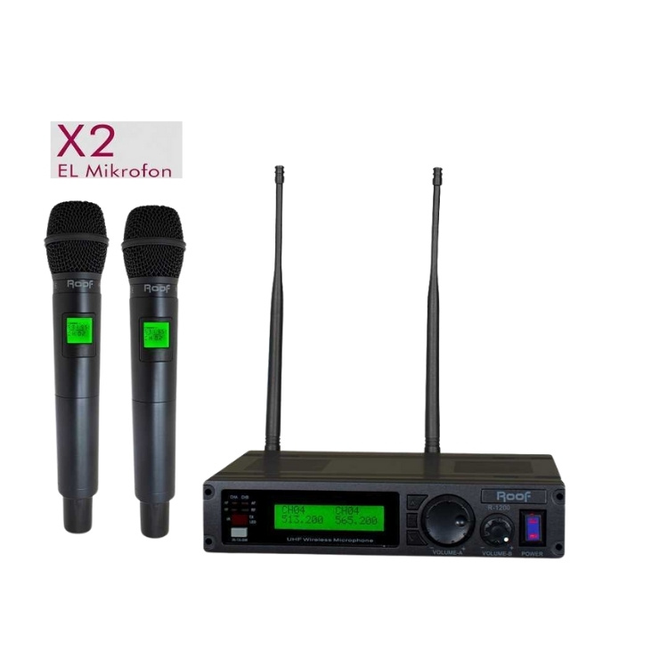 Roof R-1200EE; Kablosuz Mikrofonlar kategorisnde yer alan 2 kanal, 2 anten UHF telsiz çift el mikrofon modelidir.