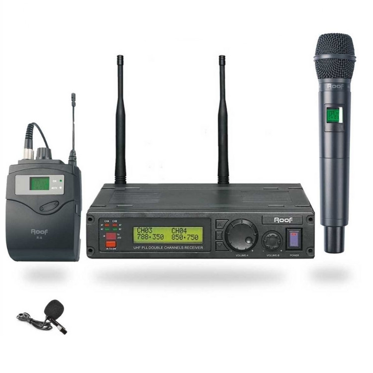 Roof R-1200EY; Kablosuz Mikrofonlar kategorisnde yer alan 2 kanal, 2 anten UHF telsiz el ve yaka mikrofon modelidir.