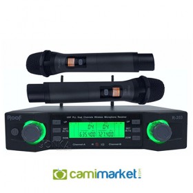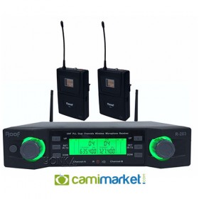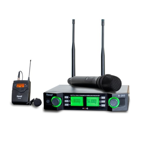 Roof R-203EY; Kablosuz Mikrofonlar kategorisnde yer alan 2 kanal, 2 anten UHF telsiz el yaka mikrofon modelidir.