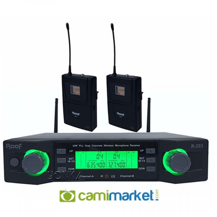 Roof R-203Y; Kablosuz Mikrofonlar kategorisnde yer alan 2 kanal, 2 anten UHF telsiz çift yaka mikrofon modelidir.