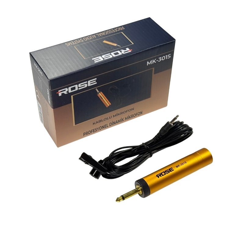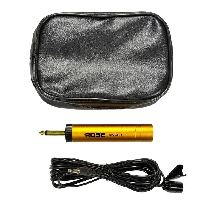 Rose MK-301S, kablolu yaka mikrofonları kategorisinde yer almakta olan gold renk metal gövdeye sahip taşıma çantalı kablolu yaka mikrofonu modelidir.
