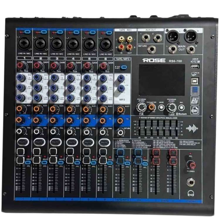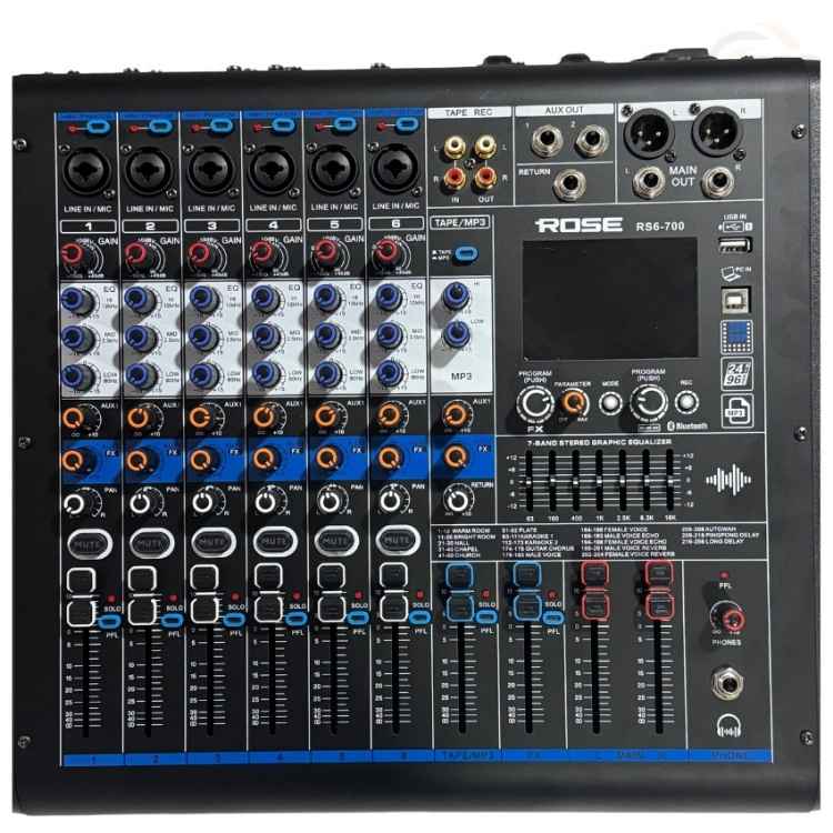 ROSE RS6-700 Mikser, güçlü ses performansı ve kullanıcı dostu kontrol yapısıyla her ortamda net, dengeli ve kaliteli ses sunar.
